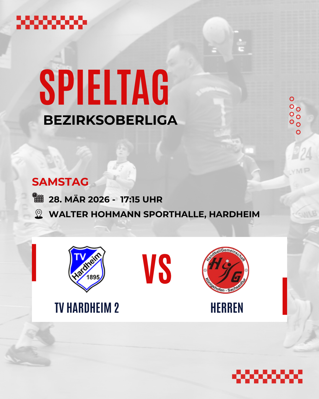 Für die Herren der HG Königshofen/Sachsenflur steht am Samstag, 28. März 2026, die nächste entscheidende Partie im Saisonendspurt der Männer-Bezirksoberliga Gruppe 2 an. Um 17:15 Uhr tritt die Mannschaft von Maag/Deis auswärts beim TV Hardheim 1895 2 in der Walter-Hohmann-Schulsporthalle in Hardheim an.